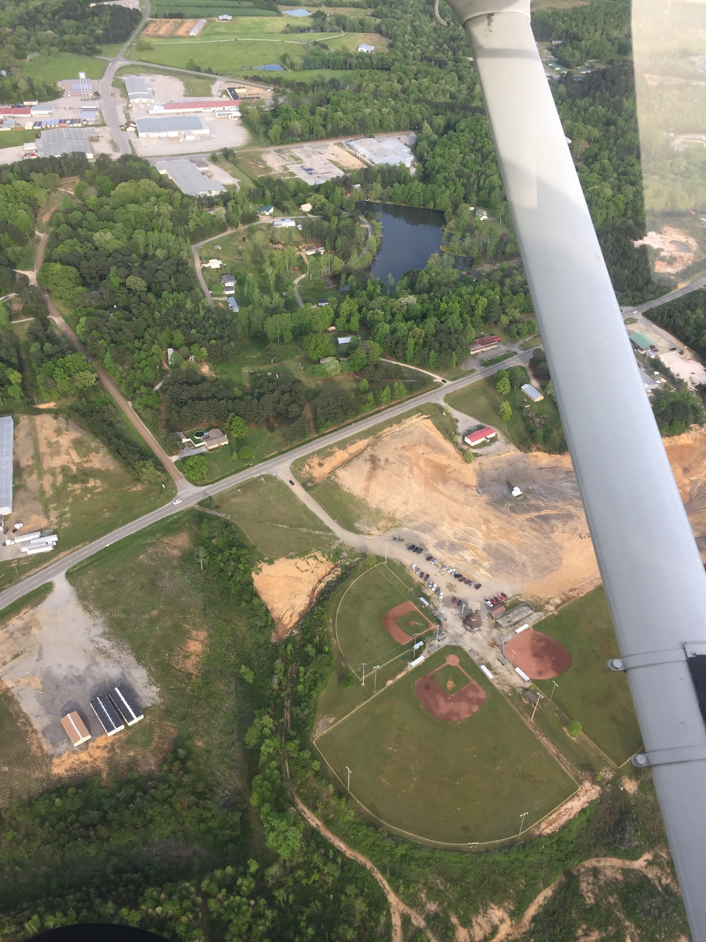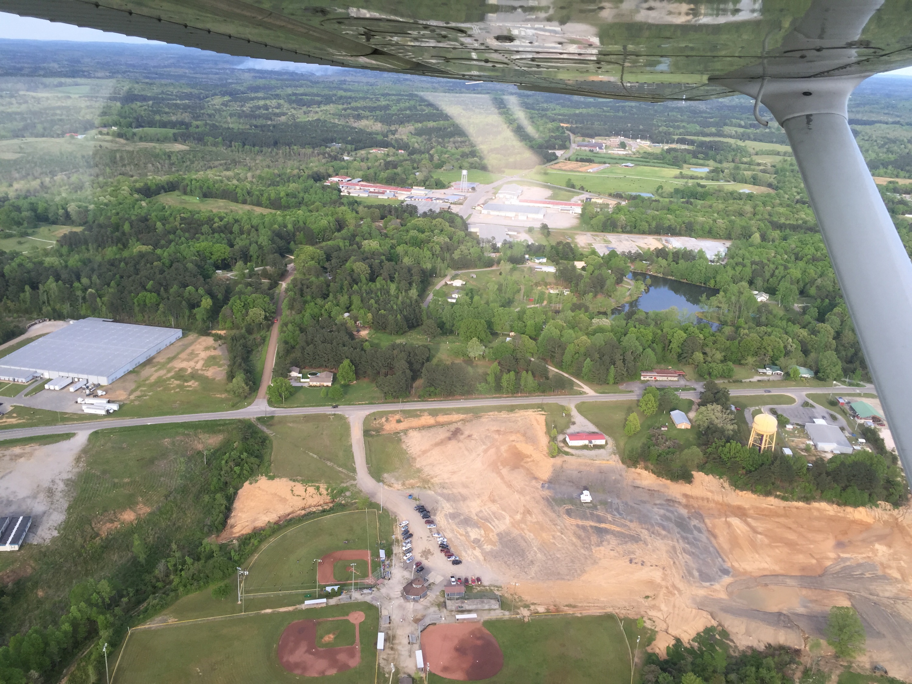 The day was June 4th, 2015. It was a hot, humid Alabama day with clear skies, great for flying if you can take the heat from the tarmac during the preflight and passenger brief. I decided and planned for a short flight up to Fayetteville Municipal Airport, FYM. It’s only about 25 miles north and a short 15 minute flight. The route north from Redstone Army Airfield goes right past the US Space and Rocket Center which has a pretty spectacular and famous Saturn V that is very visible when flying out of Redstone. Andrew was sure to get pictures of the Rocket Center.