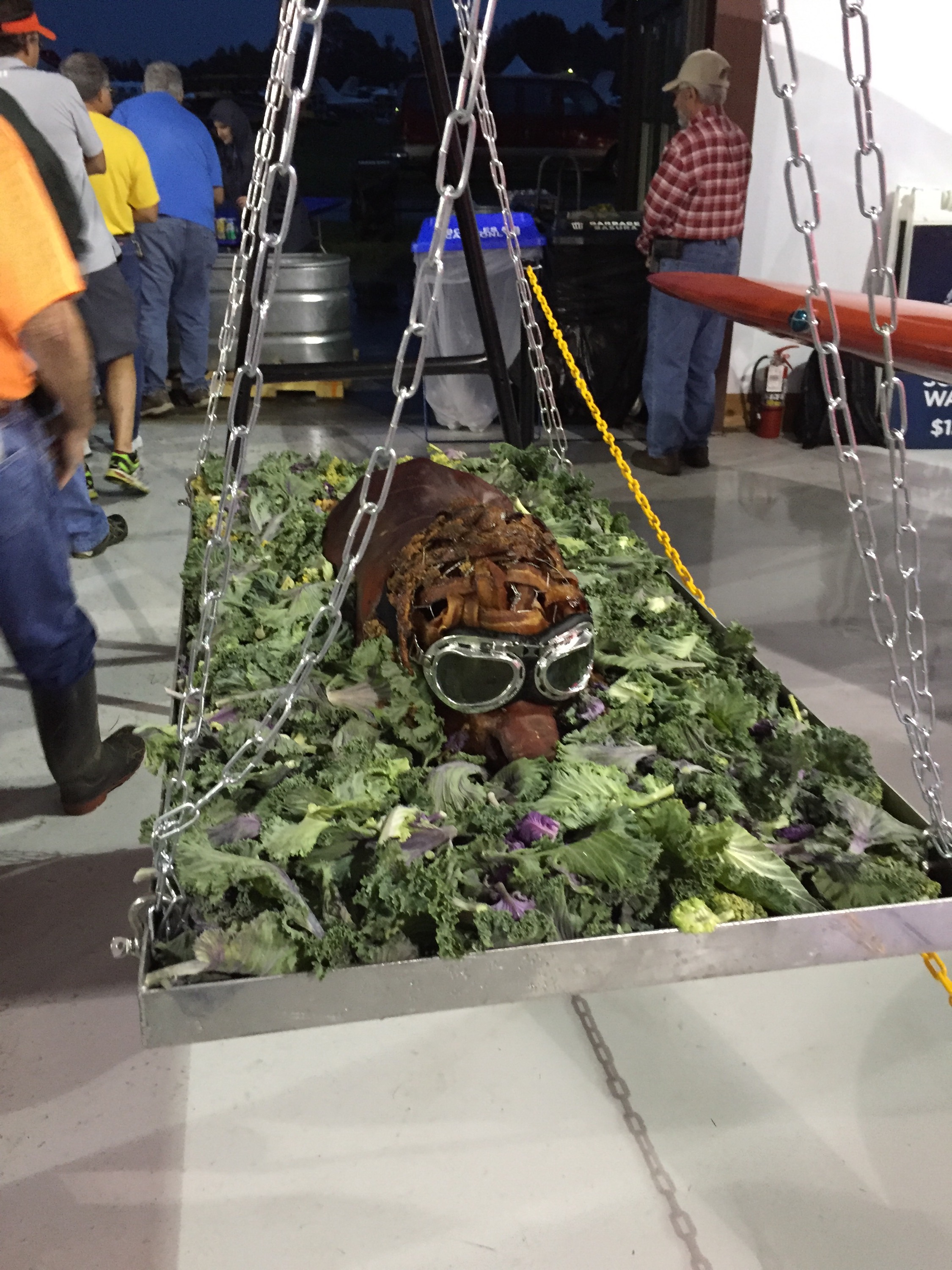 Once we landed, we were directed to taxi to the Camping are, this included taxing down a gravel road across a field. This was by far the most off pavement taxing I had done, maybe about ¼ mile off-roading in the Cessna 172! We arrived at our parking/camping spot just before the rain got there, we had about 30 min to get the plane staked/tied down and the tent set up. All of which we got done before the rain hit, although we should have left the sleeping bags in the plane. We headed over to the hanger and watched the rain come in and wait for dinner to be served. The dinner was great, it was catered by a local BBQ place and had a whole smoked hog dressed up with aviator goggles on! Dinner was great and it was followed by a great group of musicians from Nashville and included a massive amount of talent from the Nashville recording studios. Just as the music wrapped up the rain slacked off so we walked back to the tent. We found the tent was full of water, at least an inch of water in the bottom. Luckily we had our sleeping bags on pads so they were mostly dry. We had to unload everything from the tent and put it in the plane so we could bail all the water out of the plane. Yes! that’s right Dad bailed the water out of the tent with a cup! We moved the tent mostly under the wing, which worked fairly well as I woke up with only slightly we feet…